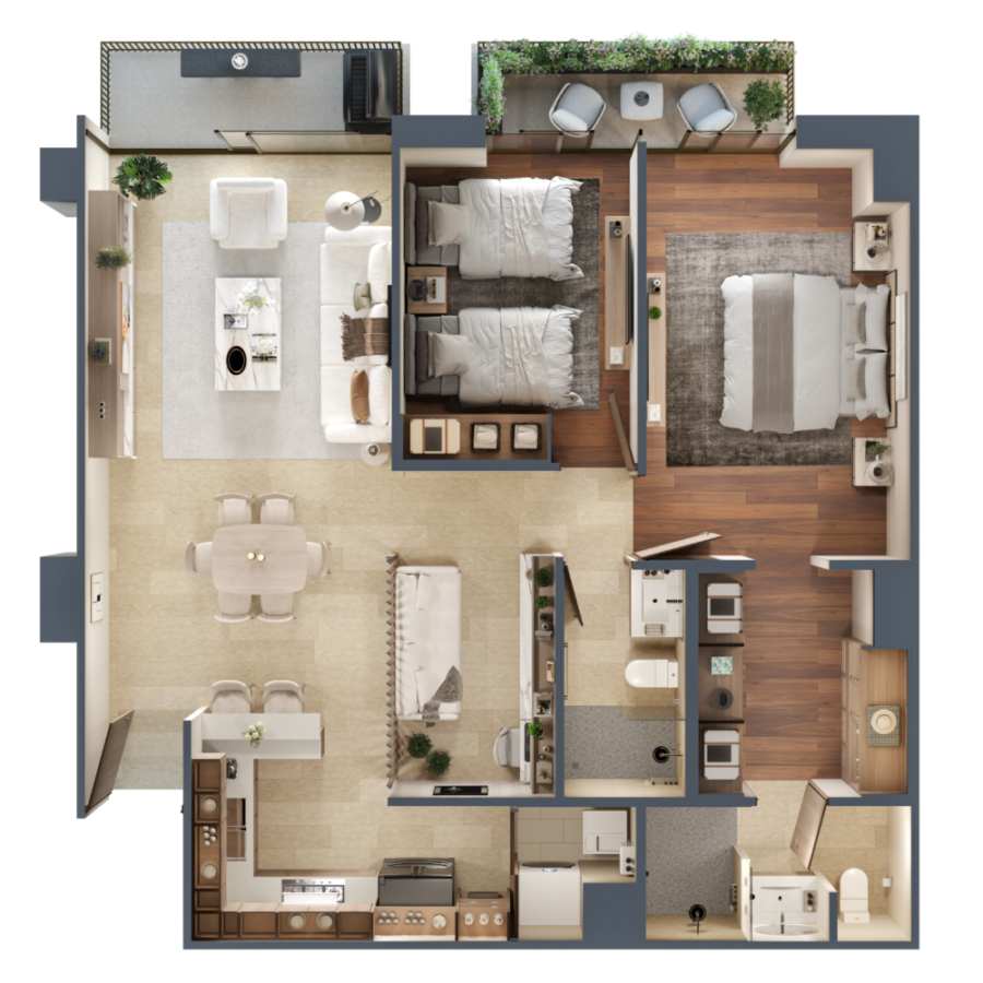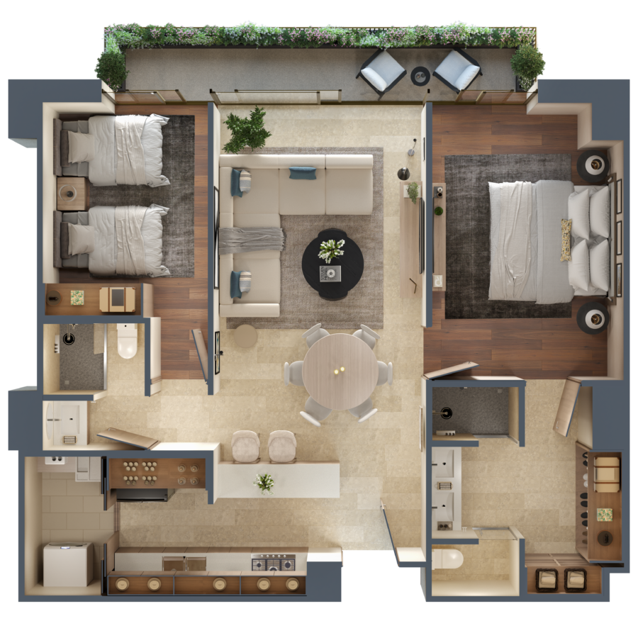 2 recámaras | 2 baños | 10.50m terraza | 1 vestidor | Área de lavado ✓ | 2 espacios de estacionamiento