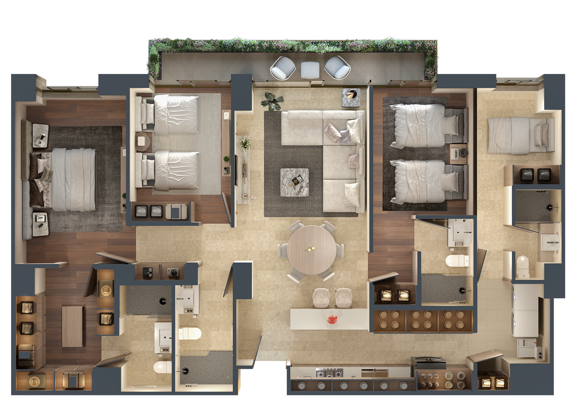 3 recámaras | 3 baños | 10.60m terraza | 1 walk-in closet | Área de lavado | Cuarto de servicio | 2 espacios de estacionamiento